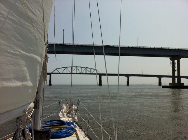 The bay bridge tunnel looms on the horizon — and we can turn north, finally with the wind behind us rather than facing us.